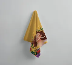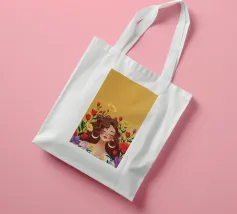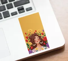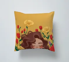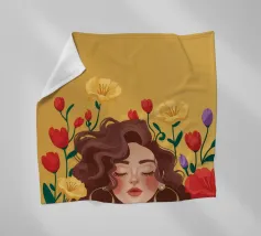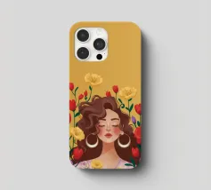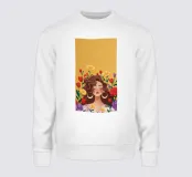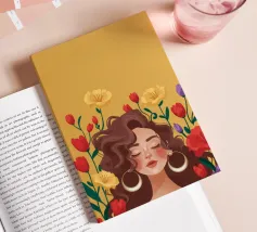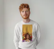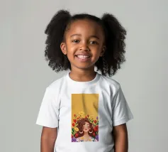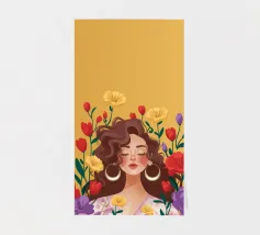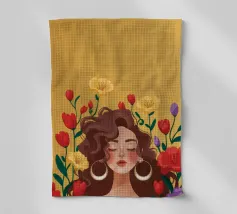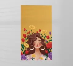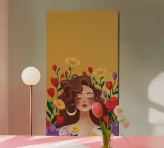 Questa opera d'arte mostra una persona con grandi orecchini a cerchio su uno sfondo di fiori colorati. La persona indossa un top giallo e i fiori creano un'atmosfera vibrante e vivace.