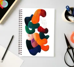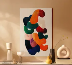 Una vibrante pittura digitale astratta con pennellate audaci e fluide in ricche tonalità di arancio, rosso, blu, verde e rosa. Le forme sovrapposte creano un senso dinamico di movimento e profondità su uno sfondo chiaro, enfatizzando la texture e l'espressione artistica.