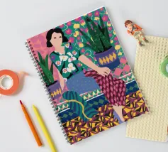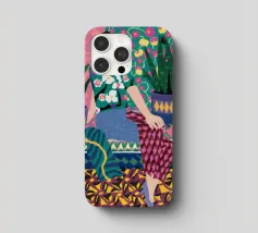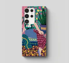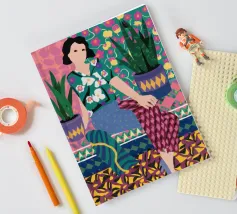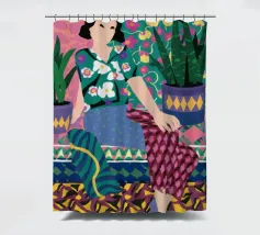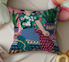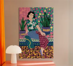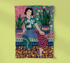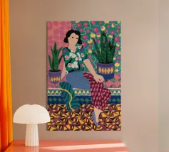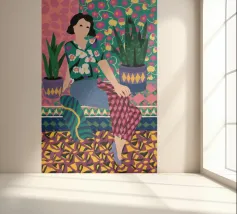 Una donna con un abito colorato e a fantasia è comodamente sdraiata su un tappeto a fantasia, immersa in un libro, circondata da una rigogliosa collezione di piante d'appartamento.