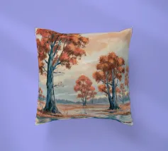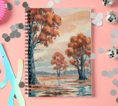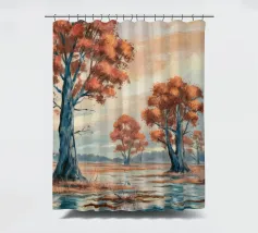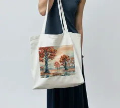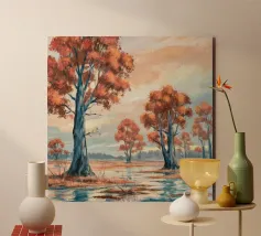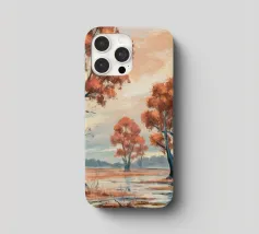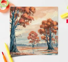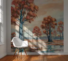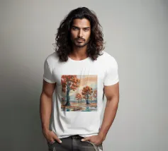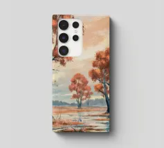 Gli alberi dalle foglie dorate risplendono di luce calda, raggruppati intorno a un lago specchiato in un'unità armoniosa.