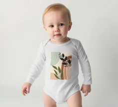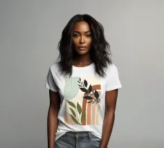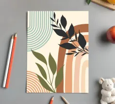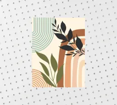 Foglie stilizzate in nero e verde si stagliano su uno sfondo di strisce curve e fluide in morbide tonalità di terra. Il disegno combina elementi botanici con forme geometriche astratte per un look moderno.