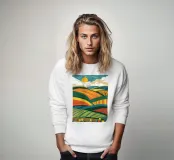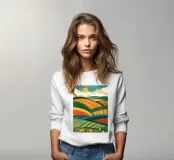 Un paesaggio vibrante di campi coltivati, ricchi e ondulati, sotto un cielo soleggiato con nuvole soffici. La rappresentazione stilizzata e colorata della campagna celebra la bellezza e l'abbondanza dei terreni agricoli.