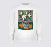 Elegante natura morta di un bouquet di fiori bianchi con verde lussureggiante in un classico vaso a motivi bianchi e blu, con arance sparse alla base.