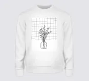 Delicati rami con piccoli fiori sono disposti in un semplice vaso di vetro. Lo sfondo presenta un motivo a griglia che aggiunge un contrasto strutturato alle forme organiche dei fiori.