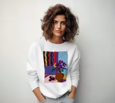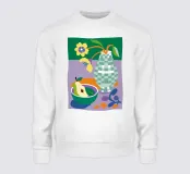 Una stravagante natura morta con una brocca di percalle verde e bianca, una pera e altre forme astratte. La composizione è giocosa e moderna, con un'affascinante atmosfera country chic e decostruita.
