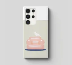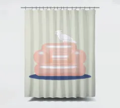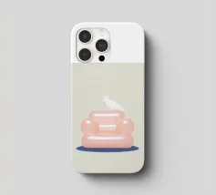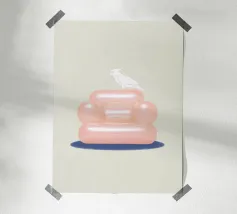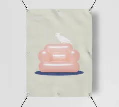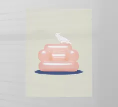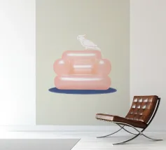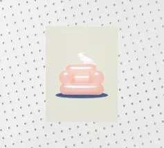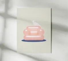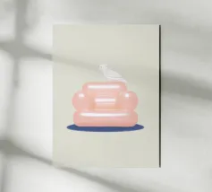 Questa illustrazione umoristica mostra un cacatua seduto in modo rilassato su una poltrona gonfiabile rosa chiaro. Lo stile minimalista in verde salvia e l'estetica nostalgica retrò rendono l'opera d'arte perfetta per qualsiasi parete moderna. Il mobile gonfiabile e l'allegro uccello aggiungono un tocco giocoso a qualsiasi stanza.