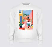 Piante in vaso colorate sono disposte lungo un sentiero tortuoso, su uno sfondo vibrante e astratto di forme geometriche. La composizione presenta varie tonalità di verde, blu, rosa e giallo, creando un'atmosfera vivace e allegra.