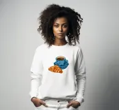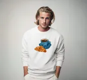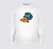 Un'accogliente illustrazione digitale in stile pittorico, che mostra una calda tazza di caffè con un croissant al burro.