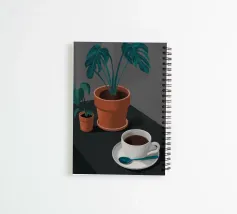 Una natura morta semplice e lunatica di una tazza di caffè nero accanto a una pianta di monstera in vaso. L'illuminazione scura e d'atmosfera crea una scena mattutina sofisticata, calma e contemplativa.