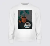 Una natura morta semplice e lunatica di una tazza di caffè nero accanto a una pianta di monstera in vaso. L'illuminazione scura e d'atmosfera crea una scena mattutina sofisticata, calma e contemplativa.