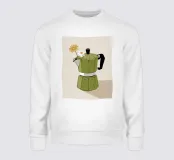 La classica caffettiera Moka è elegantemente presentata come un vaso che contiene una singola e delicata margherita bianca, unendo i rituali del caffè e la bellezza della natura in una natura morta minimalista.