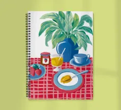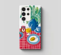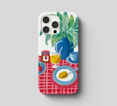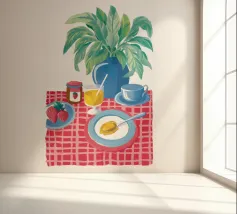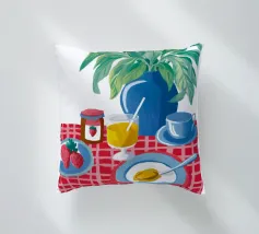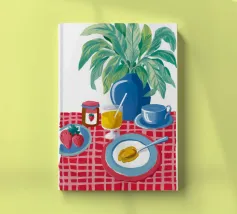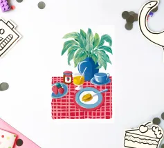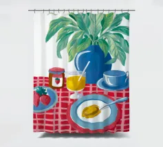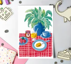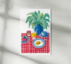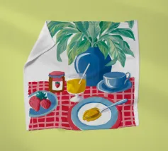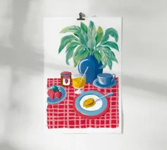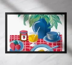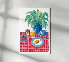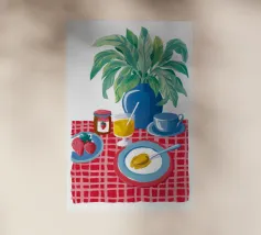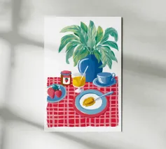 Una scena di colazione con uova e fragole su un panno a scacchi rosso irradia un delicato equilibrio.