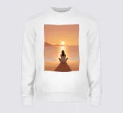 Un momento di tranquillità in riva al mare, mentre il sole tramonta dietro le montagne lontane. I colori caldi e delicati catturano l'immobilità, la riflessione e la pace di fine giornata.