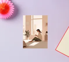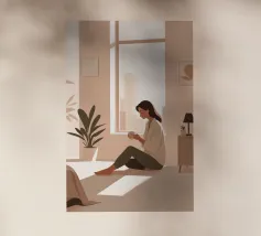 Un'illustrazione pacifica di una donna seduta vicino alla finestra del suo appartamento con una bevanda calda in mano. Il paesaggio urbano esterno contrasta con la quiete interna: una celebrazione dei momenti di calma in mezzo alla vita quotidiana.
