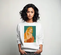 Questo dipinto raffigura una persona dai lunghi capelli neri avvolta in una coperta a motivi cardiaci, che tiene in braccio un gatto. Il morbido sfondo beige esalta il tono accogliente e confortante.