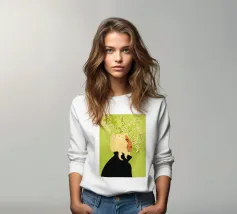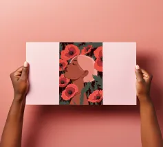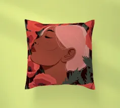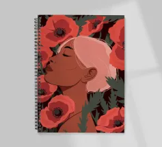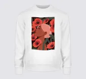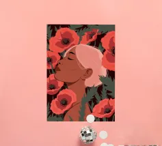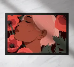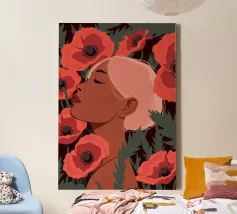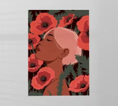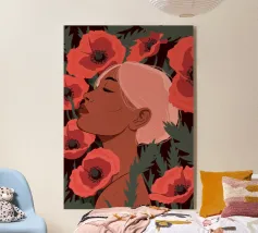 Questo dipinto raffigura una persona circondata da grandi papaveri rossi. La persona ha i capelli bianchi ed è rappresentata di profilo, creando un senso di tranquillità e di connessione con la natura.