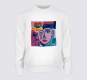 Questo dipinto presenta un volto dai molteplici colori e forme astratte. Lo sfondo è un mix di blu e rosa che crea un effetto vibrante e caotico.