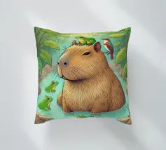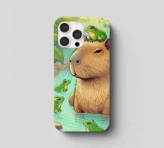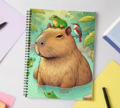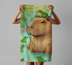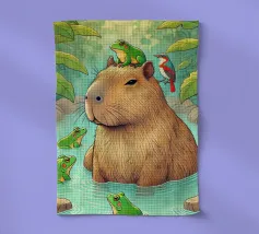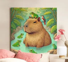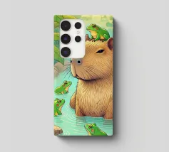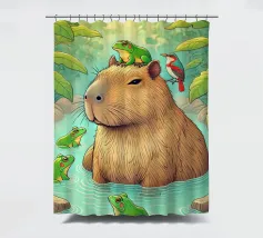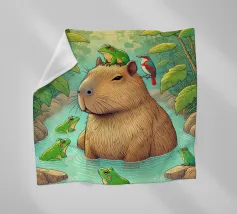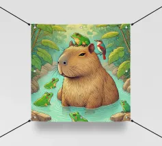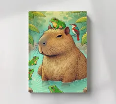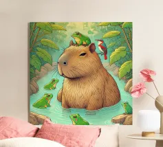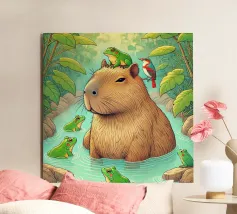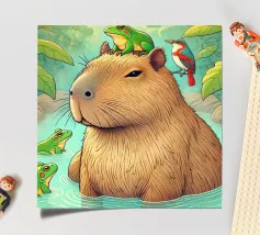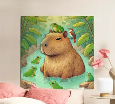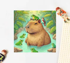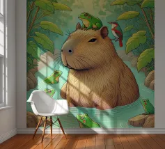 Un capibara si rilassava in una sorgente calda, circondato da uccellini appollaiati sulla testa e rane che saltellavano sulle zampe.