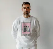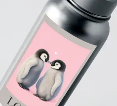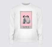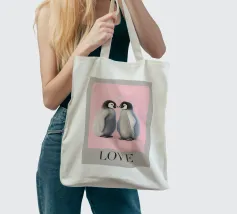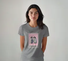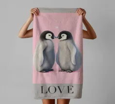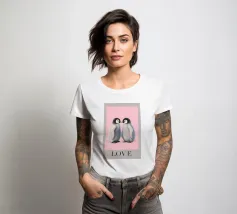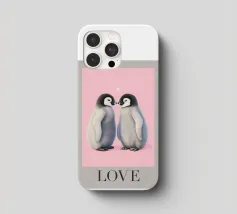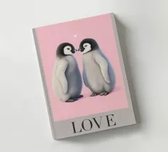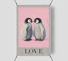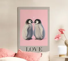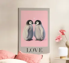 Due pinguini innamorati su uno sfondo rosa tenue, mentre un cuore simboleggia la loro dolce tenerezza. Questa illustrazione minimalista dona gioia e romanticismo a qualsiasi spazio abitativo!