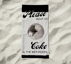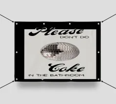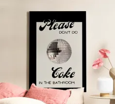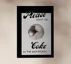 Aggiungete un tocco spiritoso e inaspettato al vostro arredamento con questo audace poster digitale. Il design presenta la spiritosa direttiva "Per favore, NON FARE COCA NEL BAGNO" in un mix di eleganti caratteri script e grassetti sans-serif, al centro di un'abbagliante palla da discoteca. Su uno sfondo chiaro e pulito con un bordo nero, questa stampa è un invito alla conversazione, perfetta per un home bar eccentrico, un bagno o uno spazio che abbraccia un'atmosfera giocosa e retrò. Con una risoluzione superiore di 7000x5000 pixel a 300 dpi, questa stampa digitale di alta qualità garantisce testi nitidi e il bagliore riflettente della palla da discoteca.