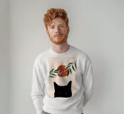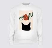 In basso è visibile la sagoma di un gatto, con le orecchie e gli occhi che fanno capolino nella scena. In alto, un cerchio rosso ricorda un sole strutturato, accompagnato da foglie verdi.