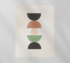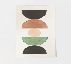 Aggiungete un tocco di fascino minimalista al vostro spazio con questa vibrante stampa d'arte astratta moderna di metà secolo, caratterizzata da un'ipnotica miscela di forme geometriche e fluide di acquerello su uno sfondo neutro morbido e cremoso. Con la sua calda atmosfera scandinavo-giapponese, non è solo arte: è un'atmosfera.