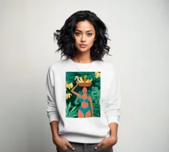 Ritratto di una bella donna dai lunghi capelli bianchi che tiene in mano un cesto di frutta tropicale, tra cui un ananas. La composizione è una vibrante, potente e rigogliosa celebrazione dell'abbondanza naturale e della bellezza femminile.