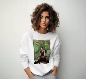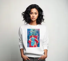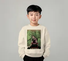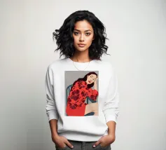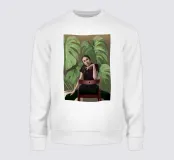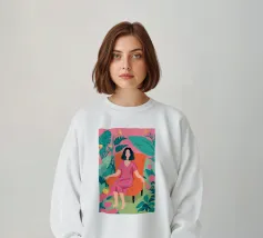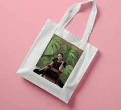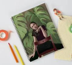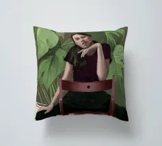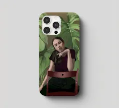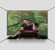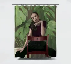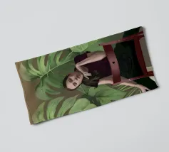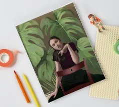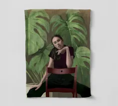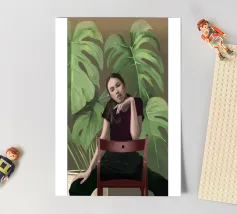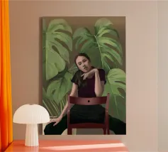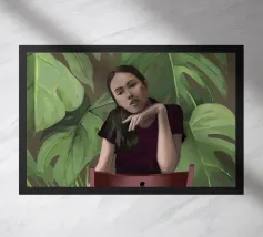 Ritratto di una donna seduta su una sedia rossa, incorniciata da grandi e rigogliose foglie di monstera. La sua posa riflessiva e la sua espressione calma evocano un senso di introspezione e chiarezza. I toni morbidi e terrosi e gli elementi naturali fondono il minimalismo moderno con la bellezza botanica, rendendo quest'opera d'arte perfetta per gli interni contemporanei.