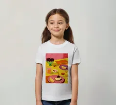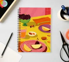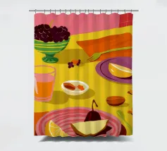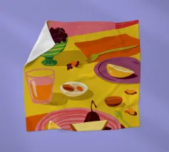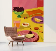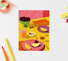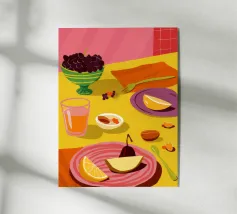Natura morta di una colazione o di un brunch a due, con piatti di cibo e bicchieri di succo d'arancia su un tavolo giallo. La scena è una rappresentazione semplice, dolce e intima di un pasto condiviso.