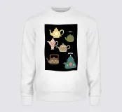 È esposta una collezione di sei estrose teiere, ciascuna decorata con motivi floreali e di frutta unici. I disegni presentano forme e colori diversi, creando un tema giocoso e affascinante.