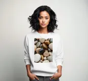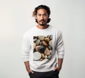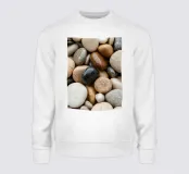 Una varietà di pietre di fiume lisce mette in mostra una serie di colori e dimensioni, appoggiate l'una all'altra. La luce si riflette sulle loro superfici, creando uno spettacolo sereno e naturale.