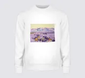 Colline ondulate ricoperte di una soffice e vaporosa lavanda si estendono verso una lontana e pallida catena montuosa. I colori delicati e la messa a fuoco morbida creano un paesaggio sognante, tranquillo e suggestivo.