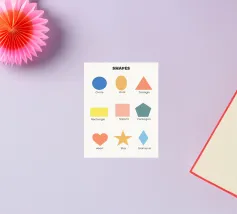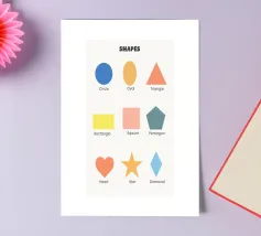 Un poster ludico ed educativo con 9 forme di base colorate: Cerchio, ovale, triangolo, rettangolo, quadrato, pentagono, cuore, stella e diamante. Progettato con una tavolozza di colori pastello e una tipografia pulita, questo grafico è perfetto per i bambini e per le classi prescolari. Ideale per l'apprendimento precoce, per la scuola materna o per l'arredamento delle pareti dell'asilo nido. Un mix ideale di semplicità e divertimento per aiutare i bambini a identificare e imparare le forme visivamente.