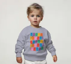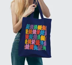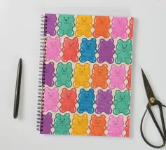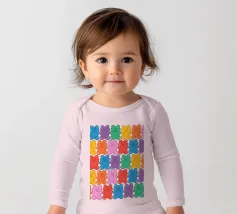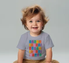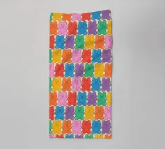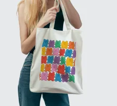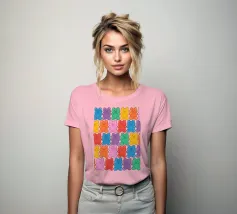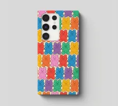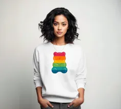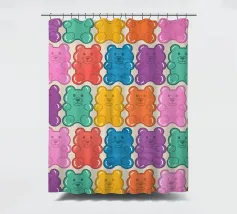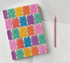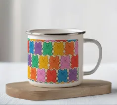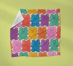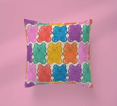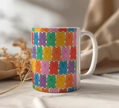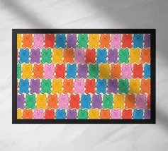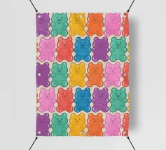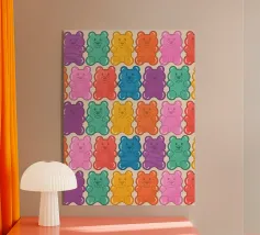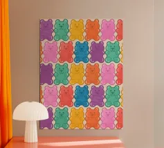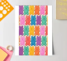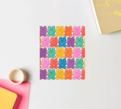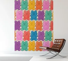 Un'illustrazione vivace e giocosa con un motivo senza soluzione di continuità di orsetti gommosi multicolori su uno sfondo chiaro. Un disegno allegro e nostalgico, perfetto per aggiungere un tocco di colore a qualsiasi spazio. Ideale per gli amanti delle caramelle, l'estetica retrò, l'arredamento dopaminico e gli interni divertenti e stravaganti.