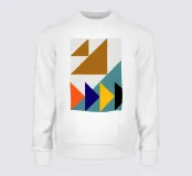 Le forme geometriche sono disposte in uno stile minimalista, con una serie di triangoli colorati. La composizione comprende tonalità di marrone, verde acqua, blu, arancione, giallo e nero, creando un modello visivo dinamico.