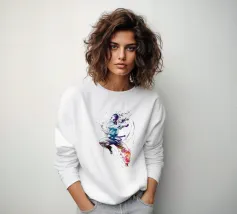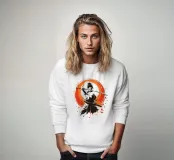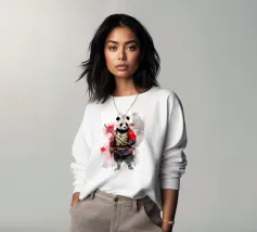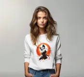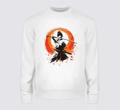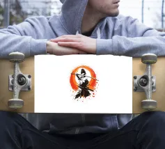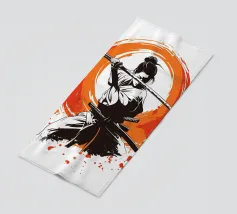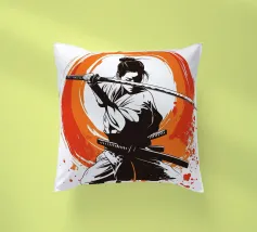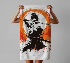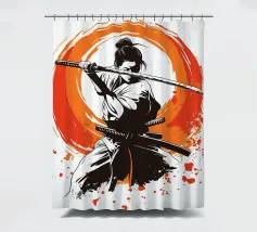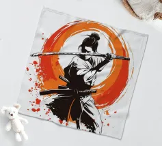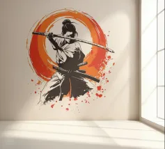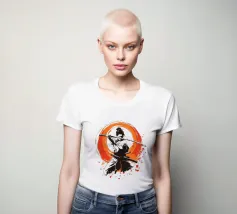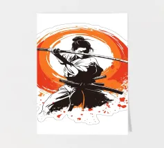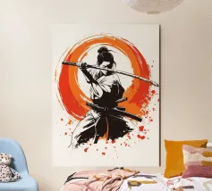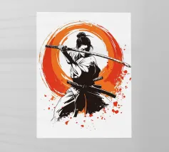 L'essenza della disciplina samurai e del potere estetico: quest'opera, che ricorda stilisticamente le xilografie giapponesi e l'estetica dei manga, si concentra sulla posa dinamica di una donna guerriera. La tavolozza di colori ridotta, composta da nero, bianco e arancione acceso, conferisce alla scena un'intensità drammatica. La pennellata espressiva sullo sfondo, che ricorda un cerchio zen, simboleggia l'illuminazione e la forza, mentre gli schizzi di sangue sul bordo suggeriscono l'implacabile realtà della battaglia. Si tratta di coraggio, determinazione e bellezza.