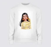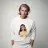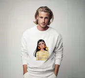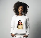 Questo dipinto ritrae una persona che indossa una camicia a righe gialle e bianche con grandi orecchini arancioni. Un piccolo uccello è appollaiato sulla spalla della persona, aggiungendo un elemento affascinante alla composizione.