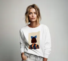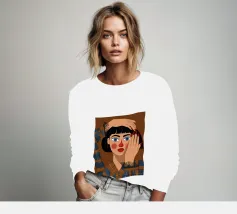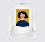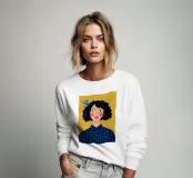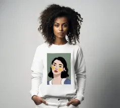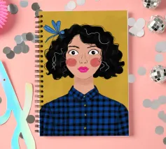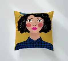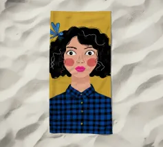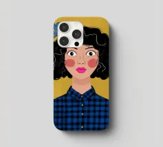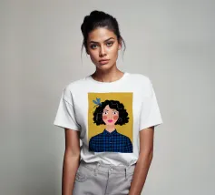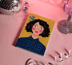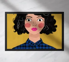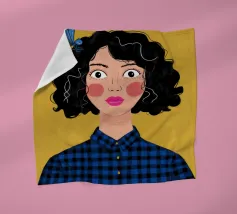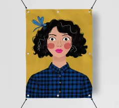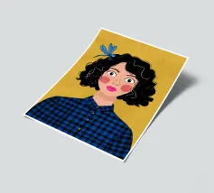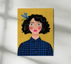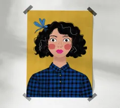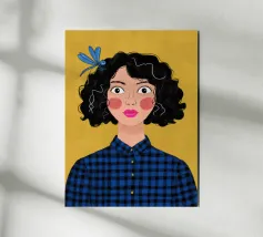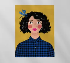 Ritratto di una donna con capelli corti e scuri, che indossa una camicia a scacchi bianchi e blu. La sua espressione pensierosa e il motivo grafico semplice creano un'impressione moderna, fresca e intellettuale.