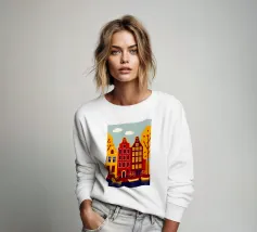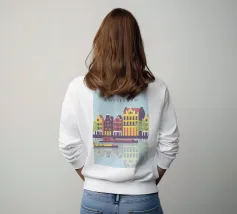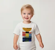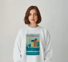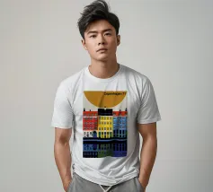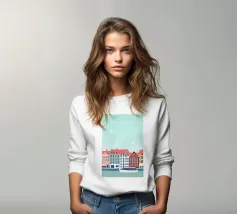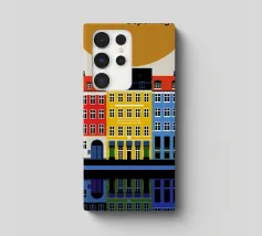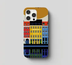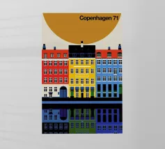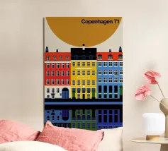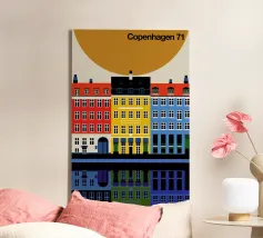 Questa immagine mostra la colorata architettura degli edifici storici di Copenhagen in uno stile moderno e geometrico. Perfetta per aggiungere un tocco di fascino scandinavo al vostro spazio.