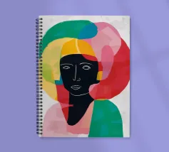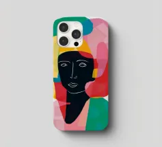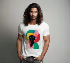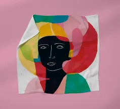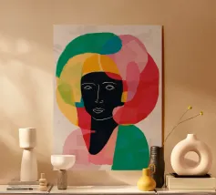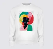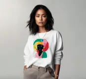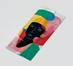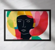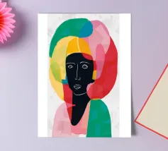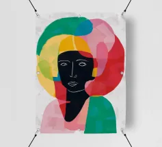 Ritratto di una figura dalla pelle scura con un grande ed elaborato copricapo composto da forme circolari e organiche colorate e sovrapposte in uno spettro di verde, rosso, giallo e rosa. Lo stile è audace e regale.