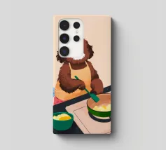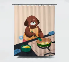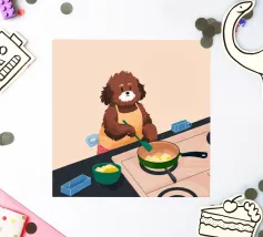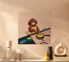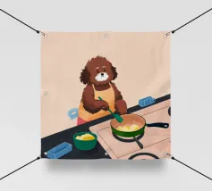 Un cane antropomorfo agita una pentola sui fornelli, circondato da verdure fresche. La calda rappresentazione celebra la gioia e l'armonia della cucina.