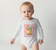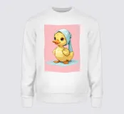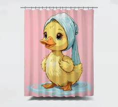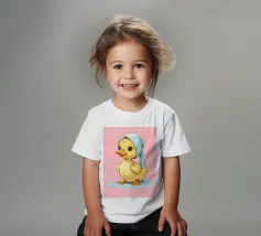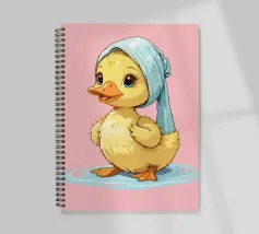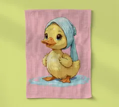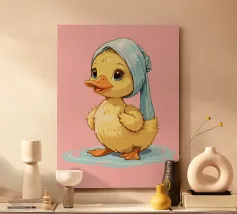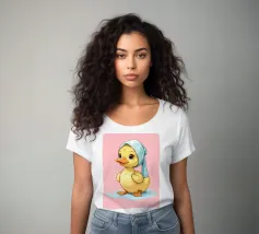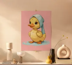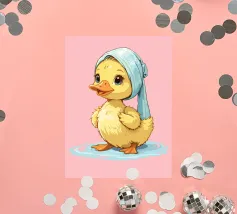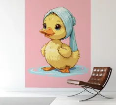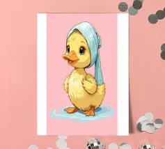 Un simpatico anatroccolo con un foulard blu si trova su una pozzanghera azzurra. L'anatroccolo ha grandi occhi espressivi che gli conferiscono uno sguardo affascinante e accattivante.
