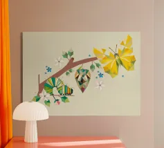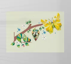 Questa illustrazione mostra l'affascinante ciclo di vita di una farfalla. Un bruco cresce e si trasforma in un bozzolo per poi sbocciare in una splendida farfalla. Un vero capolavoro della natura. Rappresentazione del ciclo completo della farfalla Le forme geometriche e vivaci sottolineano il cambiamento Bruco colorato e magnifica farfalla in dettaglio Il bozzolo simboleggia la trasformazione Ideale per gli amanti della natura e delle metamorfosi