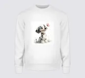 Un simpatico cucciolo di dalmata gioca felice in un prato fiorito, circondato da una farfalla e da fiori in un'incantevole illustrazione ad acquerello.