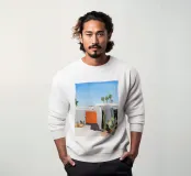 Un dipinto che mostra un edificio bianco della metà del secolo scorso con una sorprendente porta arancione, inserito in un paesaggio desertico con vari cactus e palme sotto un cielo luminoso e soleggiato.