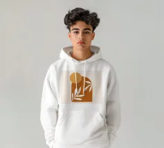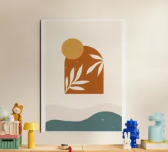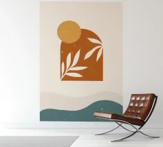 Questo motivo boho minimalista mostra un caldo sole serale su onde stilizzate, completato da delicati elementi a foglia. I toni terrosi dell'arancione e il blu tenue creano un disegno armonioso che irradia calma e naturalezza. Perfetto come murale, cuscino o tazza, questo disegno aggiunge un tocco artistico e moderno a qualsiasi ambiente. Portate calore e stile nella vostra casa con questo accento decorativo senza tempo.