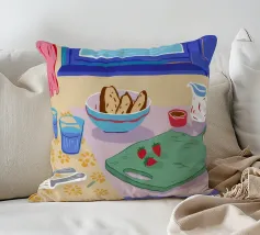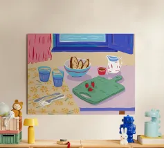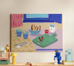 Una scena di colazione con pretzel, una bevanda e un cartone di latte è disposta su un tagliere verde, con una finestra e tende blu sullo sfondo, a rappresentare una semplice mattina di tutti i giorni.