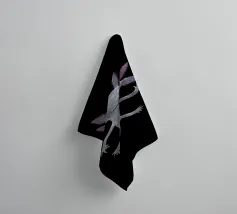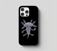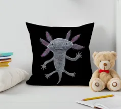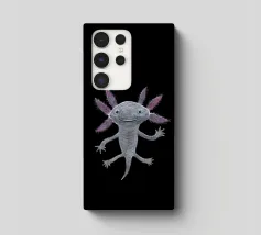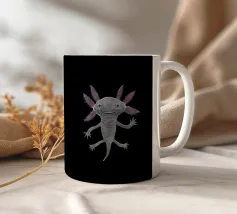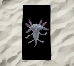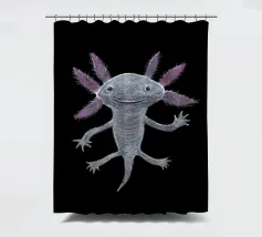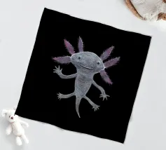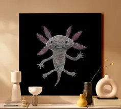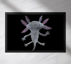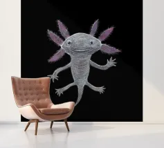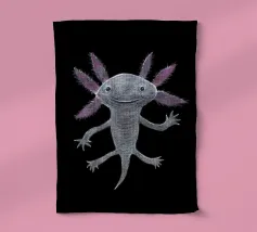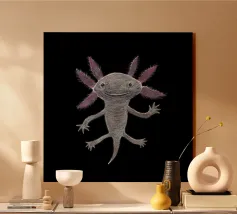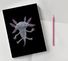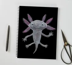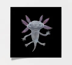 Disegno a matita colorata di un simpatico axolotl. Disegno su carta nera. Galleggia e sembra che stia salutando. Sembra molto amichevole