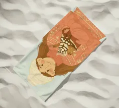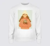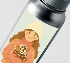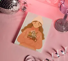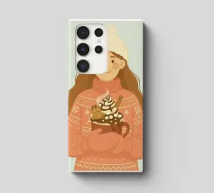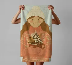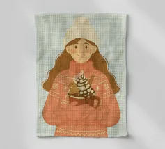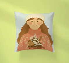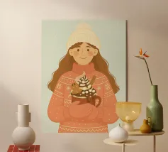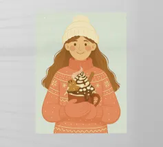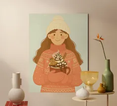 Accogliente opera d'arte natalizia di una giovane donna che indossa un maglione natalizio a maglia grossa con semplici motivi a fiocco di neve. I guanti sono abbinati alla stessa calda tonalità corallo del maglione. Il berretto di lana bianco è sormontato da un pon-pon. Ha in mano una grande tazza di cioccolata calda, con un omino di pan di zenzero, un bastoncino di cannella, panna montata, sciroppo di cioccolato e marshmallow. Questa illustrazione natalizia evoca un senso di gioia casalinga di momenti accoglienti nella stagione invernale.
