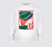 Un ritratto astratto di una donna il cui volto è oscurato da un grande cappello verde e da abiti colorati, che creano un'aura di mistero e intrigo elegante.